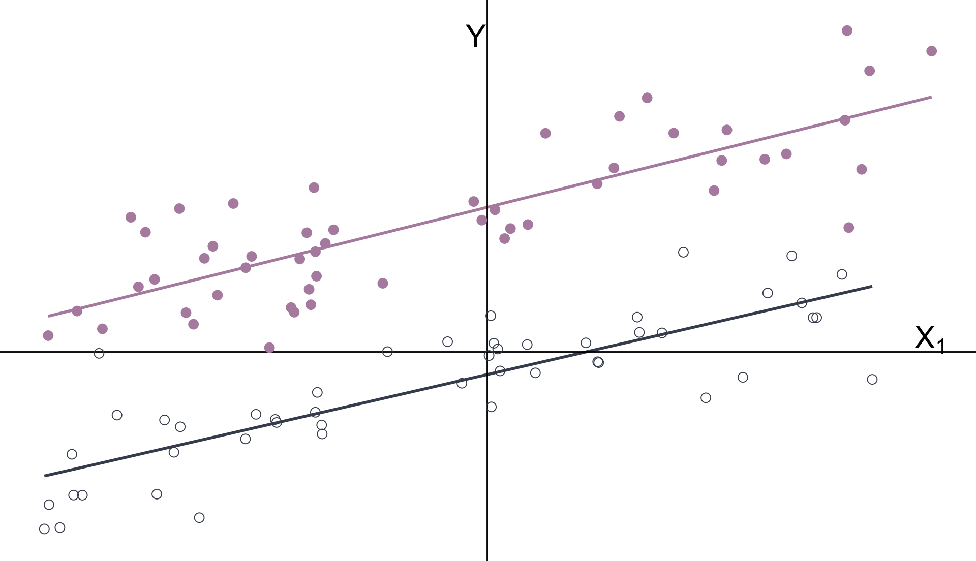 \(Y_i = \beta_0 + \beta_1 X_{1i} + \beta_2 X_{2i} + u_i \quad\) \(X_1\) is continuous \(\quad X_2\) is categorical