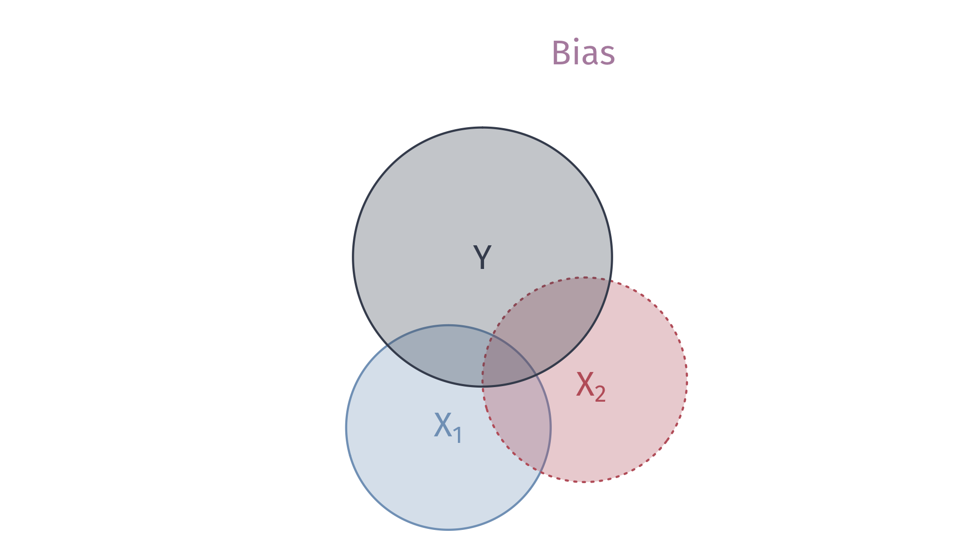 \[ \color{#B48EAD}{\text{Bias} = \beta_2 \frac{\mathop{\text{Cov}}(X_{1i}, X_{2i})}{\mathop{\text{Var}}(X_{1i})}} \]