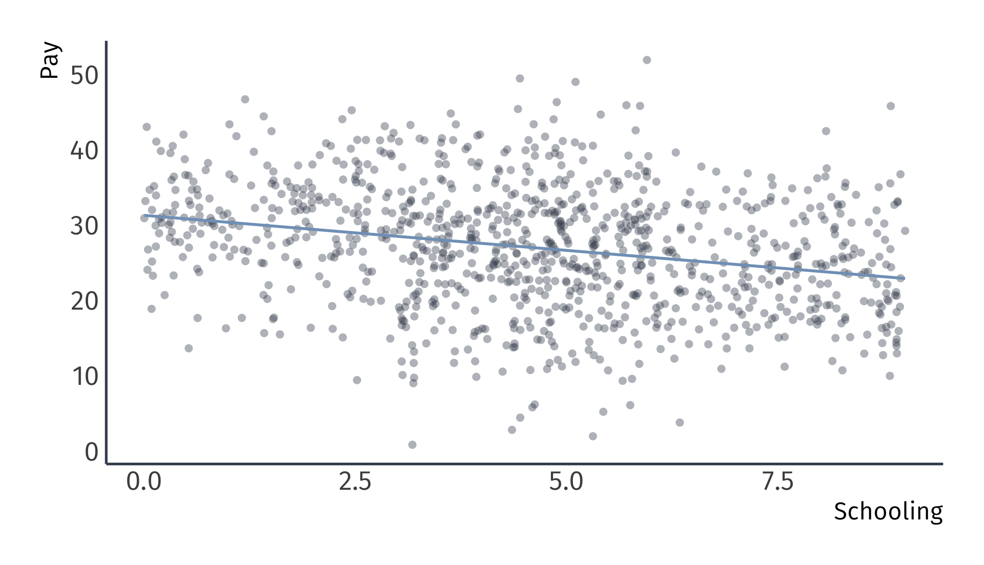 Biased regression: \(\widehat{\text{Pay}}_i = 31.3 + -0.9 \times \text{School}_i\)